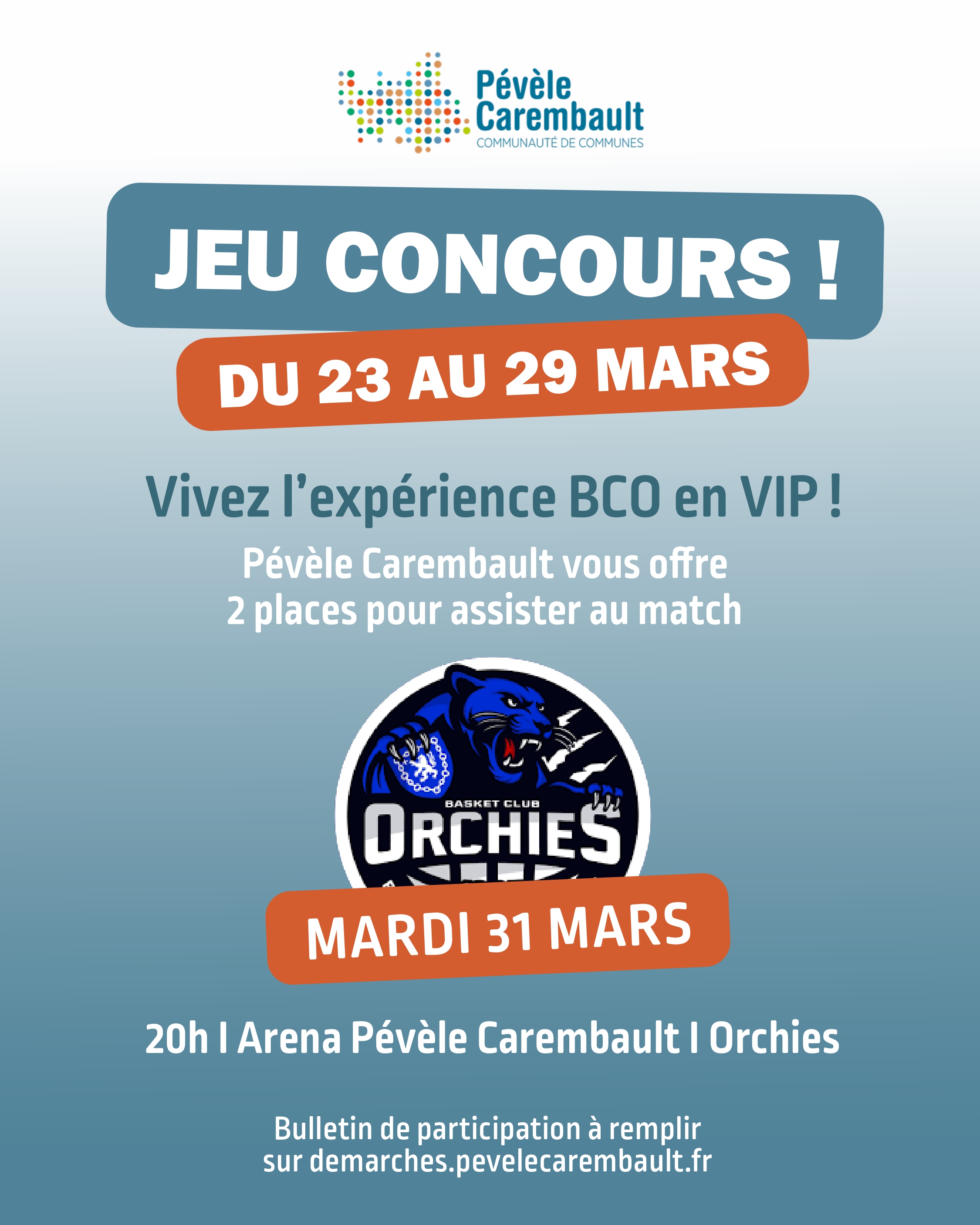 Vivez l’expérience BCO en mode VIP ! Pévèle Carembault lance un jeu concours pour assister au match de l’équipe de basket d’Orchies le mardi 31 mars 2026 face à l'équipe de l'Union Tarbes Lourdes.