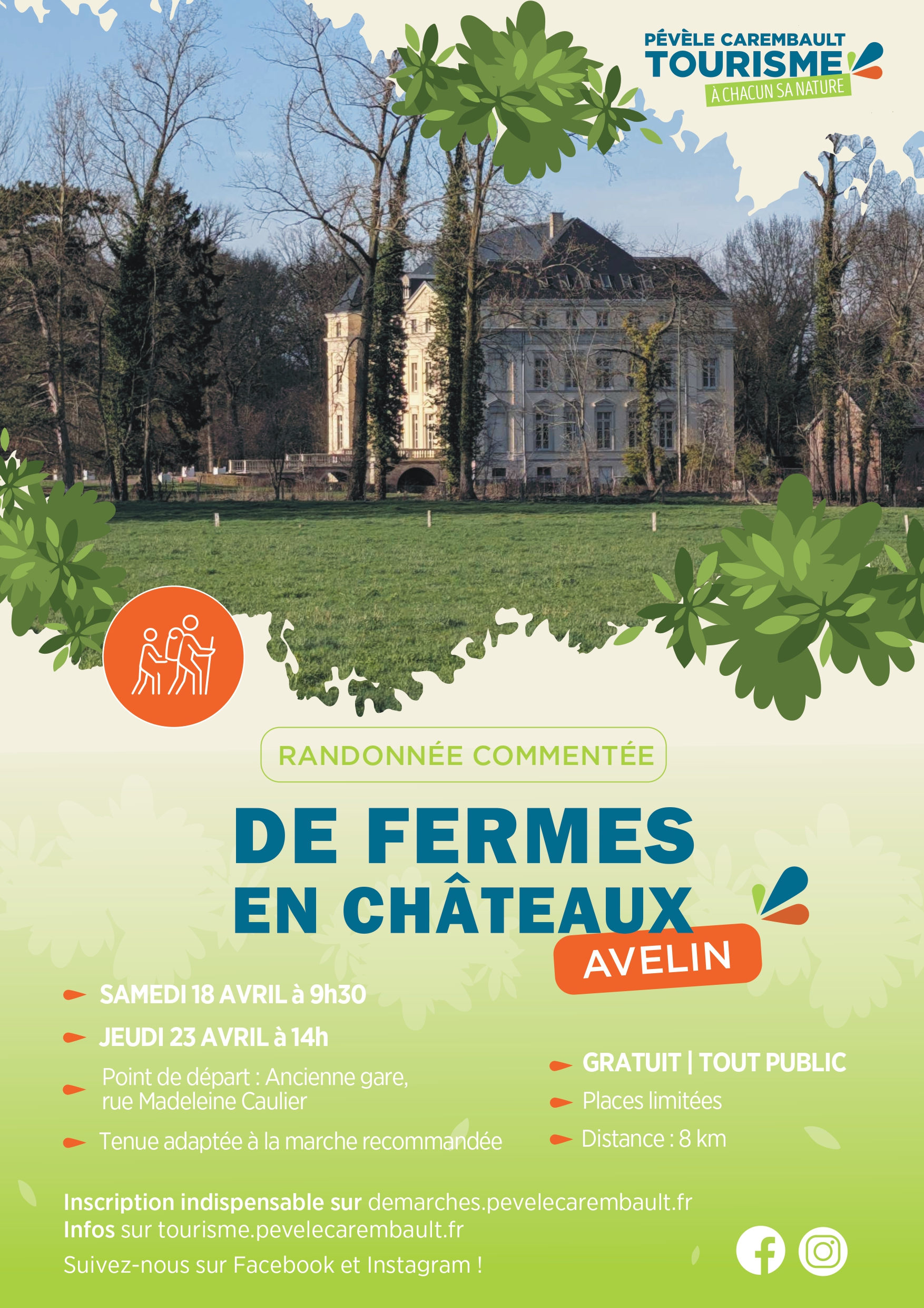 Vous avez de la chance ! Pévèle Carembault Tourisme organise non pas une mais 2 randonnées à Avelin : " De fermes en châteaux". Et bonne nouvelle, vous ne raterez rien car les 2 parcours sont identiques, seule la date change. La première se déroule le samedi 18 avril et la seconde le jeudi 23 avril.